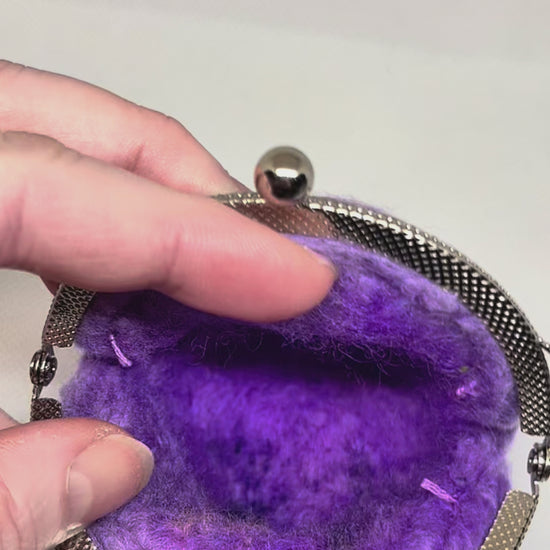 Made from 100% pure wool with an 8.5cm diameter coin purse frame, in Vancouver, BC. Approximate height & diameter 8.5cm.