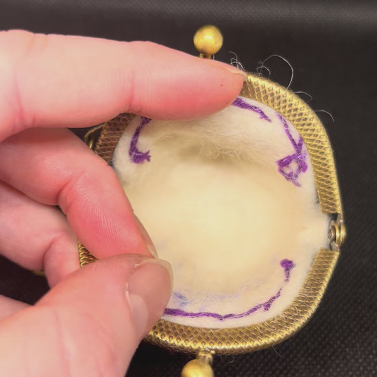 100% wool, wet felted body, needle felted details, hand stitched coin purse closure. Colours modelled after the Bi Pride flag.