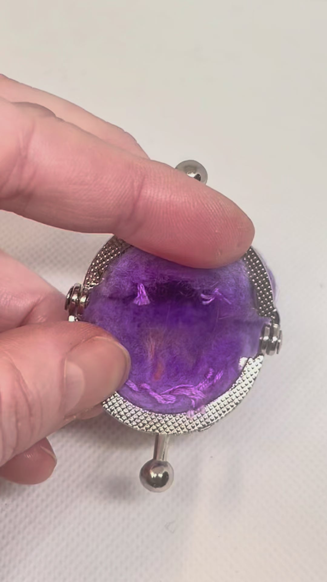 Made from 100% pure wool with an 4cm diameter coin purse frame, in Vancouver, BC. Approximately 4cm in width and depth