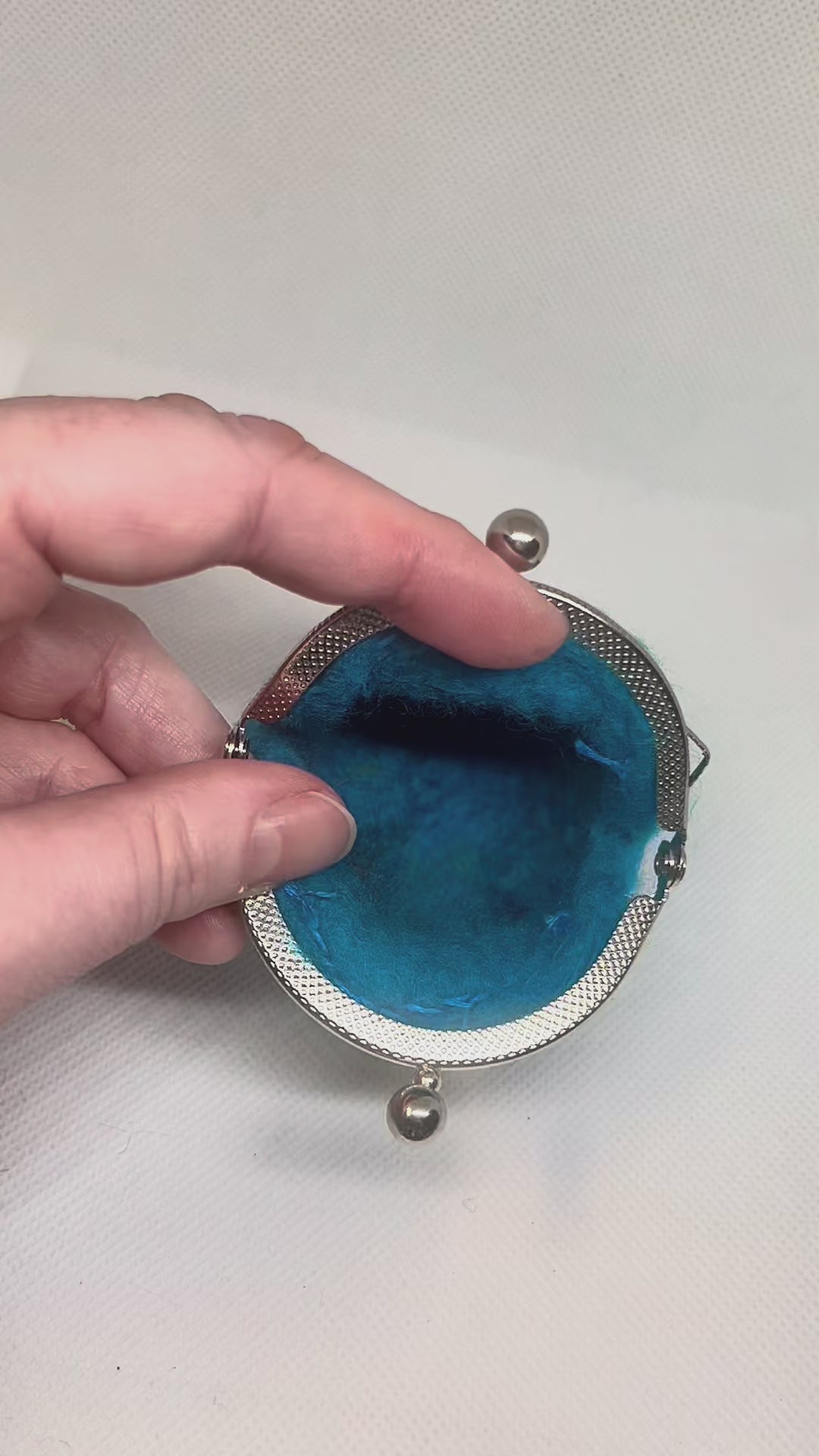 Made from 100% pure wool with an 6.5cm diameter coin purse frame, in Vancouver, BC. Approximate height & diameter 6.5cm.