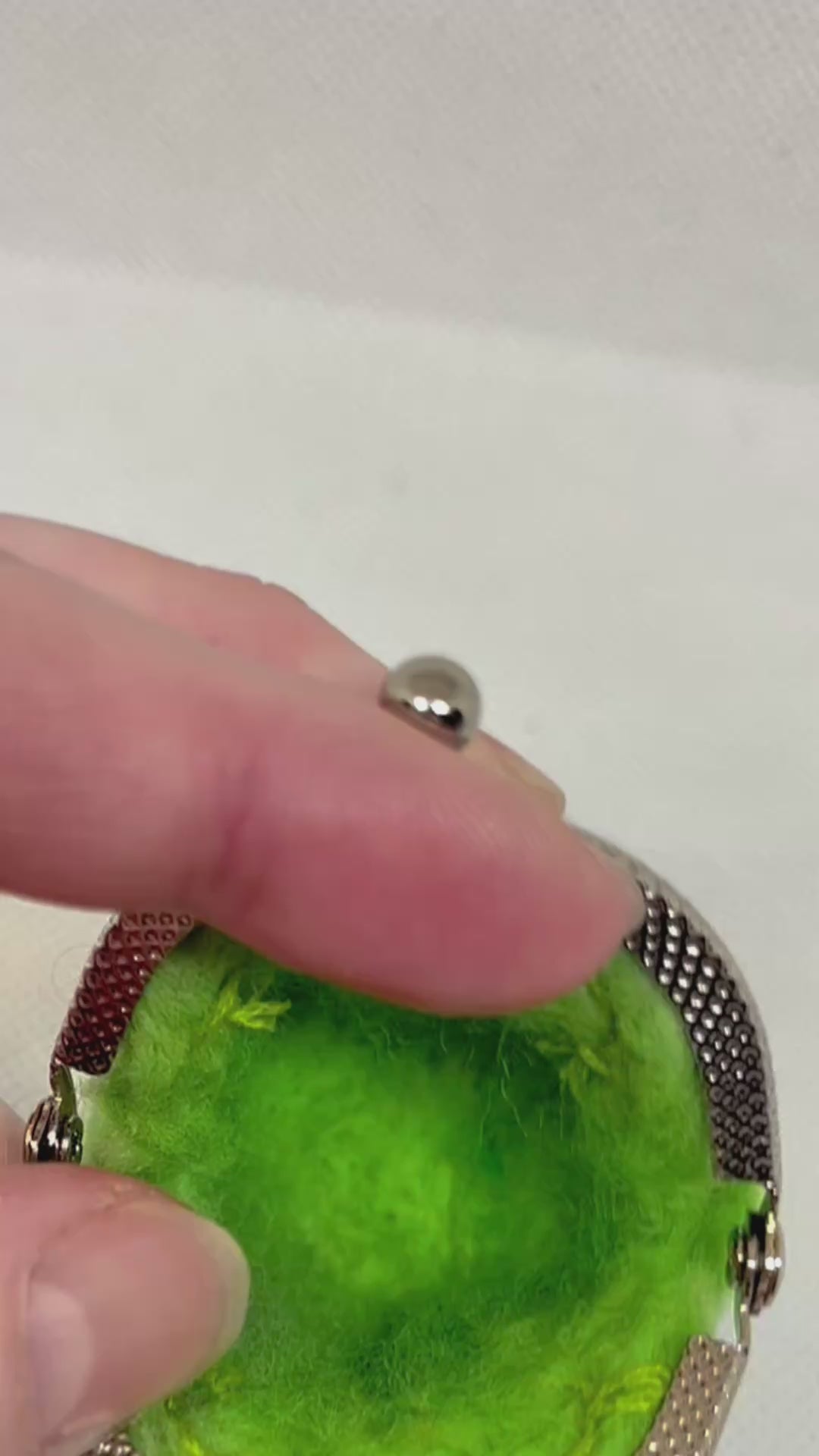 Made from 100% pure wool with an 5cm diameter coin purse frame, in Vancouver, BC. Approximate height & diameter 5cm.