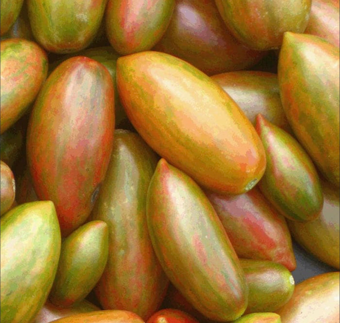 Green/red/gold 2” grape tomato. Great for snacking and salads. Tangy & tropical taste. Grown in Burnaby, no spray, at Green Zebra Farm.