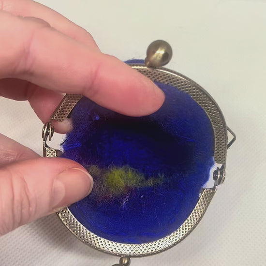 Made from 100% pure wool with an 6.5cm diameter coin purse frame, in Vancouver, BC. Approximate height & diameter 6.5cm.