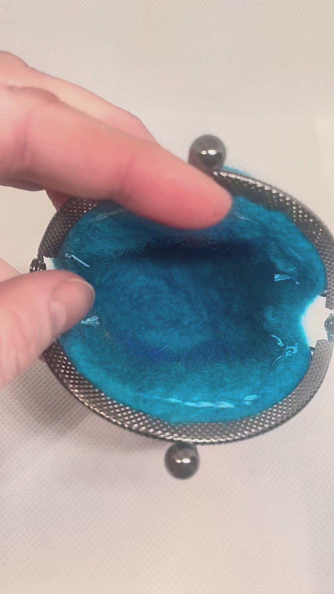 Made from 100% pure wool with an 8.5cm diameter coin purse frame, in Vancouver, BC. Approximate width & depth 8.5cm