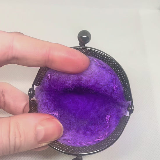 Made from 100% pure wool with an 6.5cm diameter coin purse frame, in Vancouver, BC. Approximate height & diameter 6.5cm.